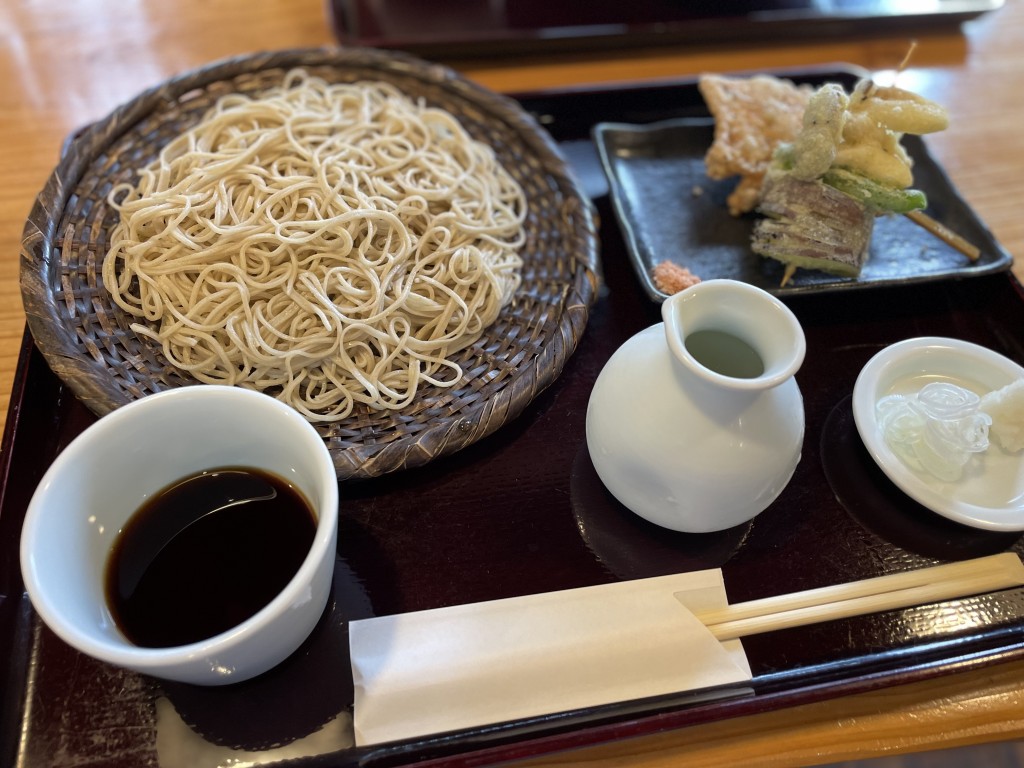 せいろ蕎麦(二八蕎麦)に、程よく黒胡椒のきいた手羽先のから揚げと野菜天ぷら串が付いてきます。お店で手打ちしているお蕎麦はコシがありながら、細めなのでするすると食べれて、そばつゆもお醤油の風味がしっかりと感じられます。