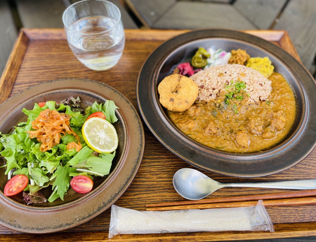 カレーには添えられている副菜も、豊後梅や、万願寺唐辛子、かぼちゃなどを使用したものが数種類添えられて、カレーと混ぜながら色んな味を楽しみます。
