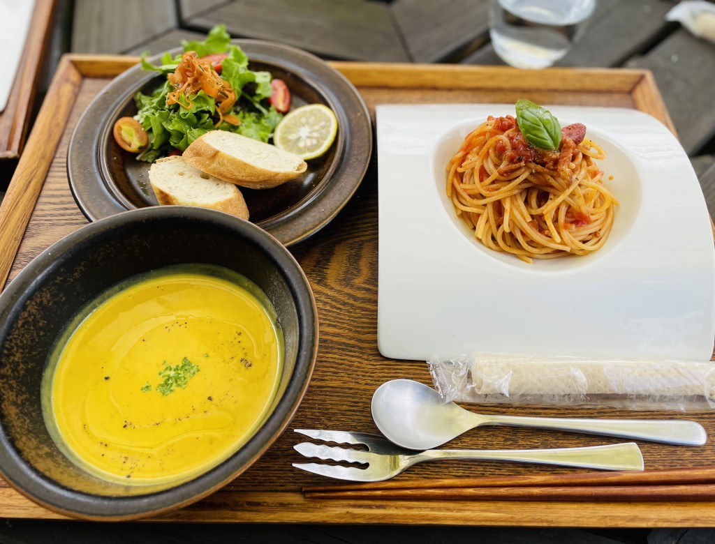今回は自家製ベーコンのトマトソースパスタに、かぼちゃと栗のポタージュ、サラダと自家製バケット、プチデザートがセットで付いてきました。