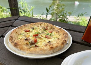 パスタの自家製ベーコンと、ピザに乗っているスモークチキンはテラス横の大きいクルミの木の枝で燻製にしたそうです。